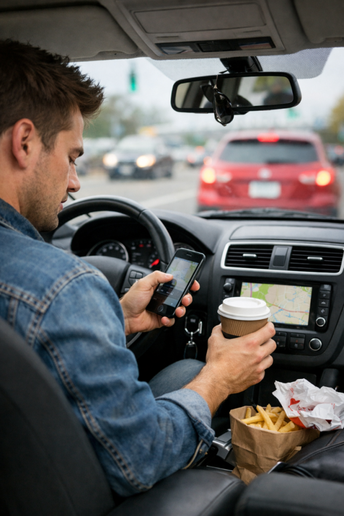 Eating and Drinking While Driving Accidents — Handling food, opening containers, or reacting to spills pulls attention away from driving at critical moments. When a driver reaches for dropped food or a drink, reaction time drops sharply, increasing the likelihood of rear-end collisions and crashes in congested California traffic corridors.